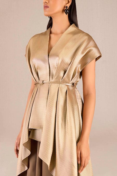 Metallic gold box pleated jacket featuring asymmetric hem detailing. Paired with a draped pleated asymmetric hem skirt and a matching belt.