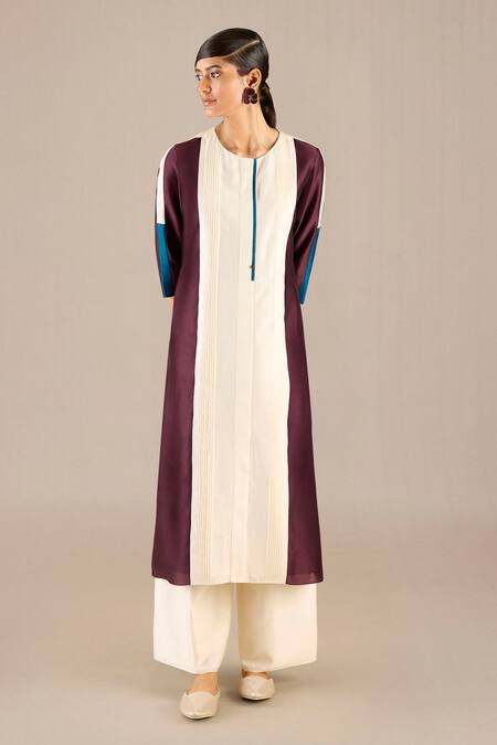 Purple kurta featuring knife pleats in the front and a contrast panel. Paired with a palazzo pant and a color-block dupatta.