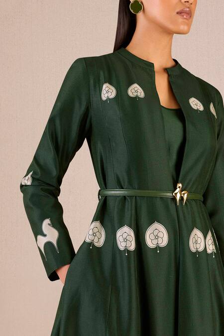 Dark green chanderi jacket featuring betel leaf and horse motif prints. Paired with a coordinating solid inner top and straight pant with side pockets.