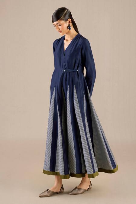 Blue midi dress crafted in Chanderi fabric featuring a V-neckline and full sleeves