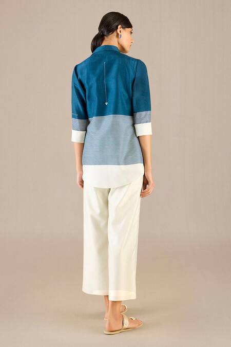 Blue Chanderi Shawl Neck Dariya Striped Shirt Pant Set