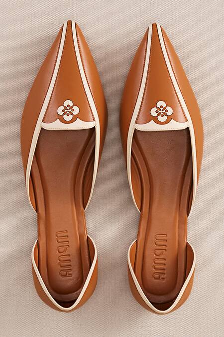 Inlay floral design on the toe area, Pointed toe silhouette, Contrasting ivory trim along the edges