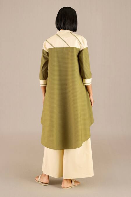 Pineapple yellow and tea green colorblocked kurta featuring three fourth sleeves and a round collar neckline. Paired with a flared palazzo in a matching hue.