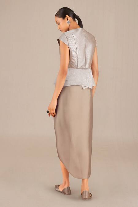 Metallic silver woven peplum jacket featuring an all-over stripe pattern and overlap panel