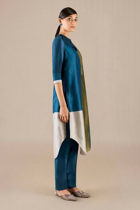 Teal color-block kurta featuring a V-neckline and button detailing. Paired with matching pants for a complete look.