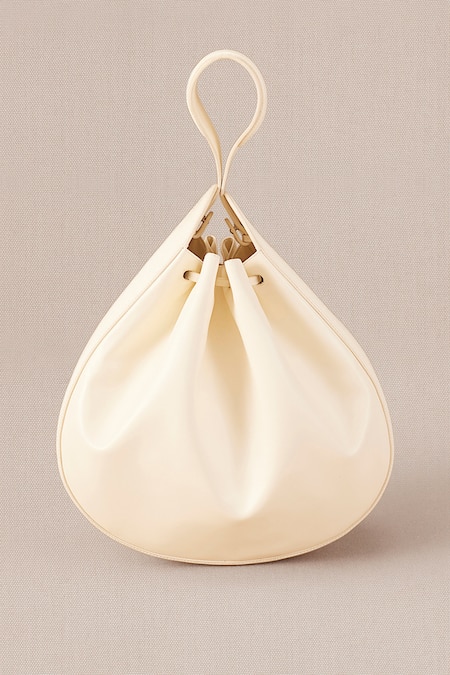 Ivory crossbody bucket bag featuring a unique corded handle detail