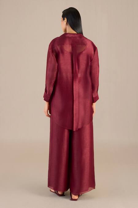 Maroon solid shirt featuring full cuff sleeves and a collar. Paired with a sleeveless inner top, palazzo, and coordinating belt.