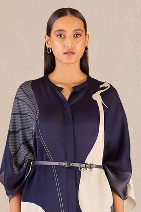 Dark purple kaftan style shirt featuring floral and peacock prints. Paired with coordinating solid straight fit pant and a brass accents leather belt.