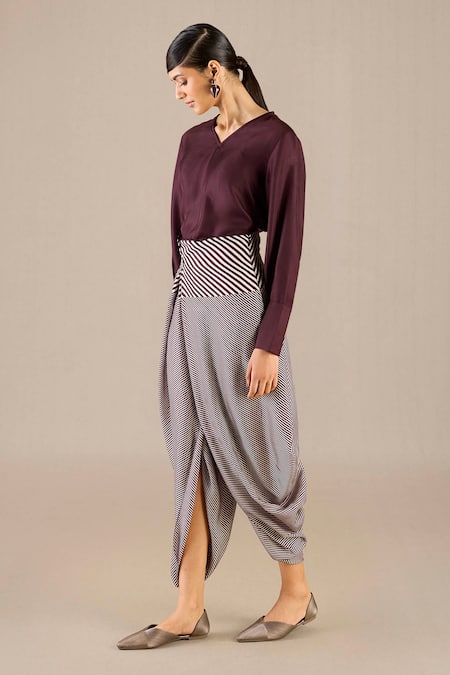 Purple V-neck top in a plain silhouette with full sleeves. Paired with a woven stripe dhoti featuring a unique draped design.