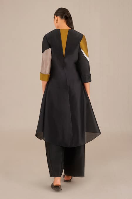 Black colorblocked tunic featuring an asymmetric hem, side tie-up, and delicate embroidery. Paired with a matching palazzo for a cohesive look.