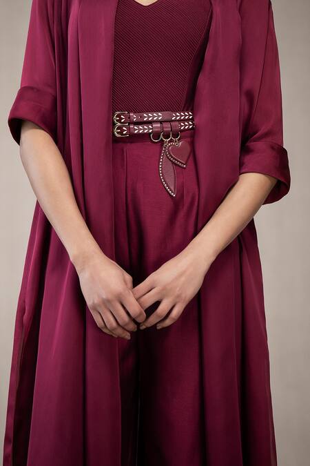 Maroon embellished belt crafted from faux leather with laser cut details