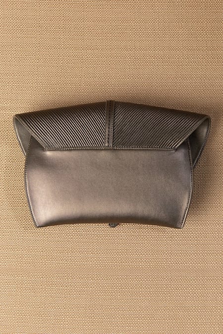 Grey mini clutch featuring cord work with a curved flap and center detailed strip
