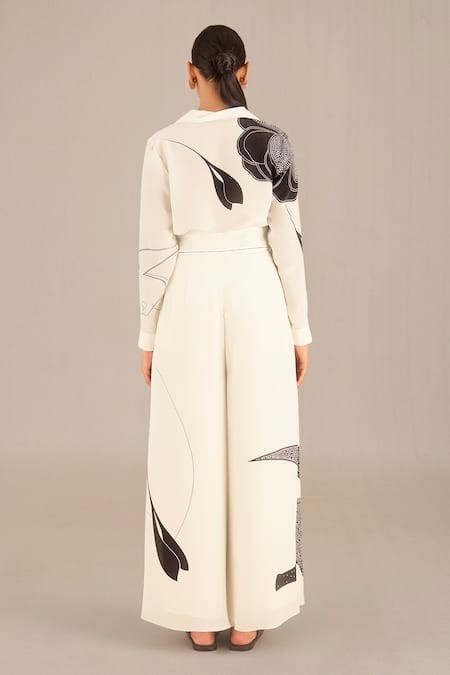 Ivory shirt with floral placement print featuring a concealed placket and full sleeves. Paired with matching palazzo and a belt.