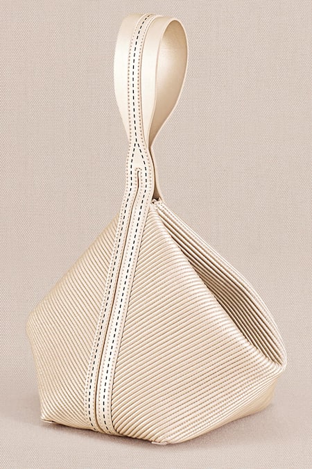 Metallic pearl bucket bag featuring cord embellishments and a unique design