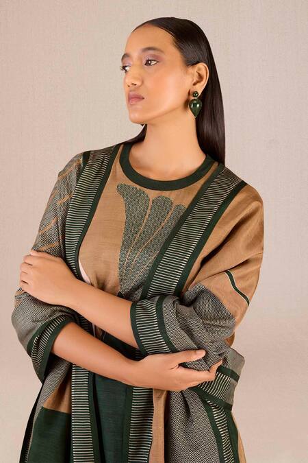 Dark green kurta featuring a colour-blocked floral pattern, paired with coordinating palazzo pants. Accompanied by a matching colour-blocked dupatta.