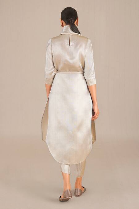 Silver cowl neck tunic featuring stripe woven motifs and a rounded hem. Paired with a dhoti pant and a belt.