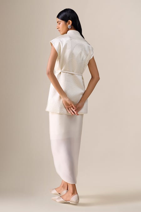 An ivory Chanderi cotton silk jacket featuring intricate quilting and subtle paan leaf motifs, with a mandarin collar and a wrap-around design. Paired with an ivory satin draped skirt and a matching faux leather belt with tassels.