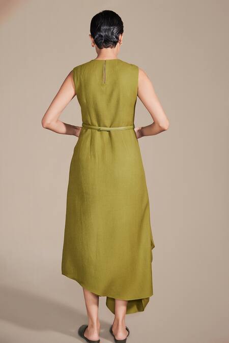 Leaf green thick wool asymmetric dress featuring cowl draped detailing. Comes with an enameled belt for added style.
