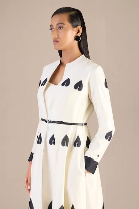 Ivory longline jacket featuring full sleeves and spades print detailing. Paired with an inner top and pant, along with a coordinating belt.