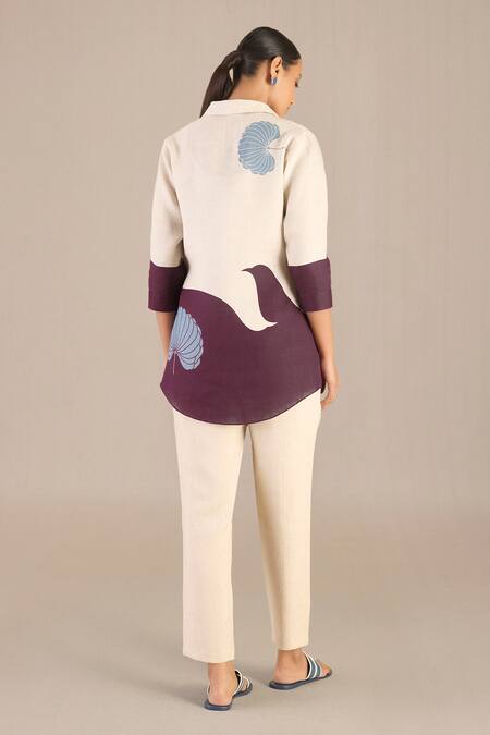 Beige linen shirt featuring a collar and three-quarter sleeves with an abstract print in purple and blue. The set includes a matching inner and pant for a complete look.