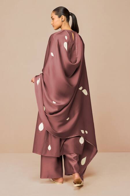 Cotton silk kurta set featuring a vibrant terracotta base with ivory paisley motifs. Paired with matching flared palazzos and a dupatta.