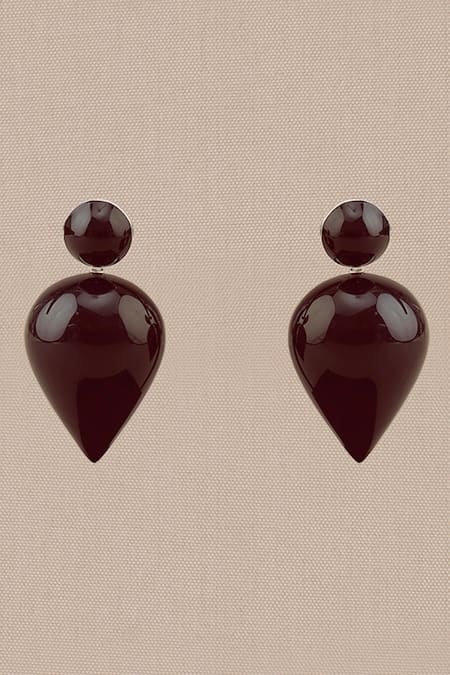Burgundy enameled drop shaped earrings featuring round studs and silver detailing