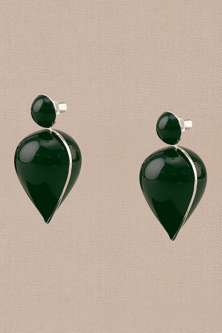 Forest green enameled drop earrings featuring round studs and silver detailing