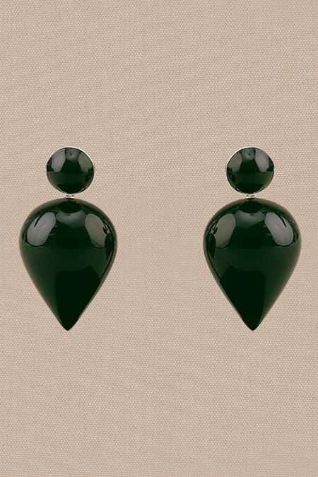 Forest green enameled drop shaped earrings featuring round studs and silver detailing