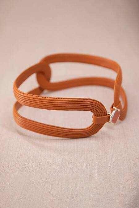 Tan corded hollow belt made from faux leather, featuring interlaced belt loops at the back and a casted enamel buckle