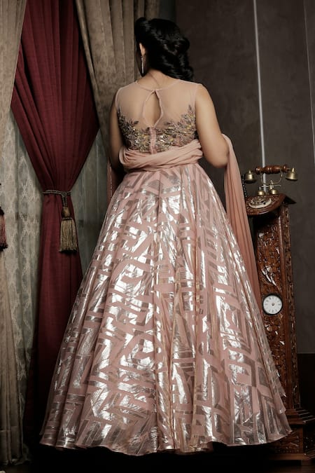 Layered lehenga >Geometric motifs on lehenga >Sheer panelled blouse >Back cut-out blouse