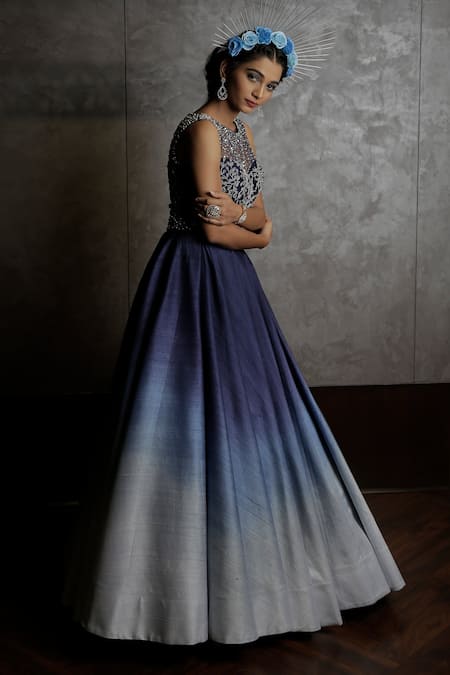 Blue ombre lehenga in raw silk base & pearl-sequins embroidered waistband. Comes with zardozi, pearl & cutdana floral embroidered blouse.