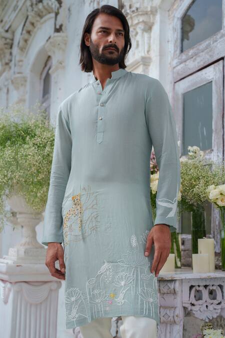 Mint green kurta featuring resham and bead placement embroidery in floral and animal patterns. Paired with ivory trousers for a complete look.