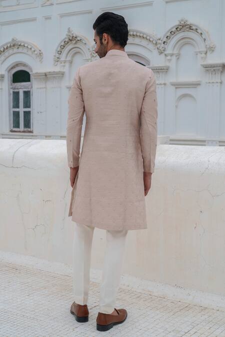 Beige kurta featuring full sleeves and band collar with banarasi knot embroidery. Paired with ivory trousers for a complete look.