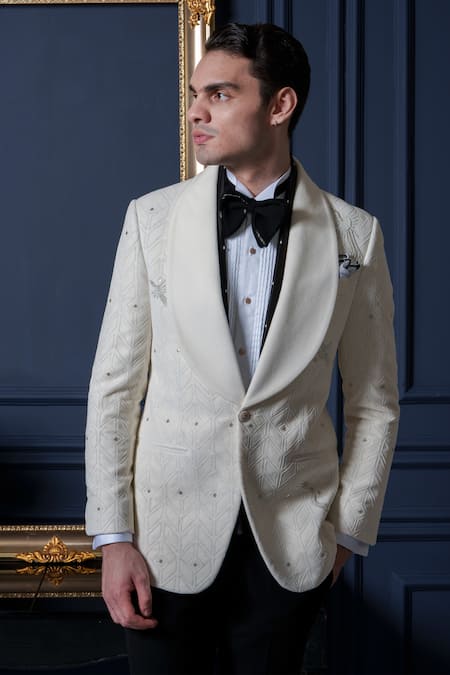 Bead and cutpipe detailing on tuxedo, Pintuck detailing on shirt, Velvet fabric for tuxedo