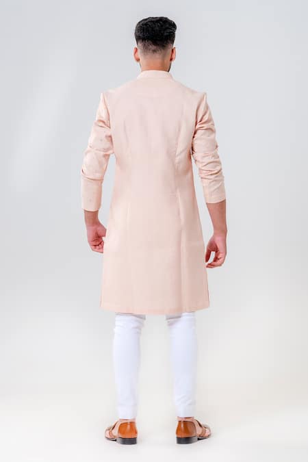 Salmon pink kurta featuring a geometrical self-design base with cutdana embroidery. Paired with a white pant for a coordinated look.