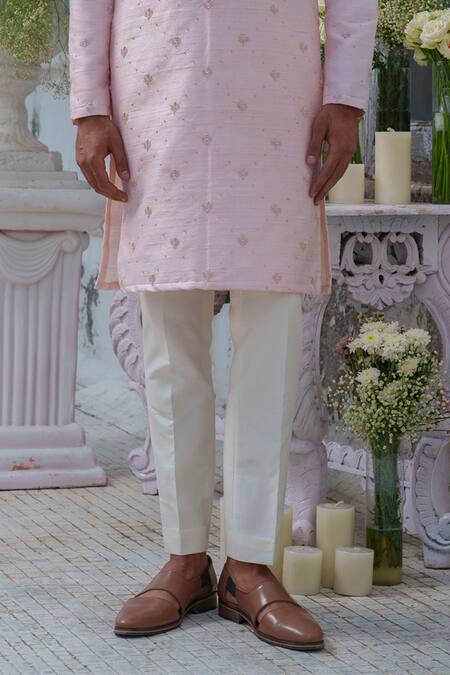Pink kurta featuring cutdana, bead, and thread embroidery in a floral pattern. Paired with ivory cotton silk trouser.