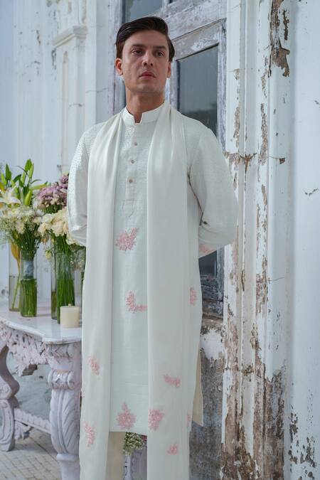 Ivory kurta featuring full sleeves, mandarin collar, and bead and thread embroidery in a floral pattern. Paired with a cotton silk trouser and a modal silk stole.