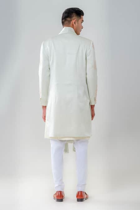Extended lapel with flower bloom embroidery, Shank buttons for closure, Side slits for ease of movement