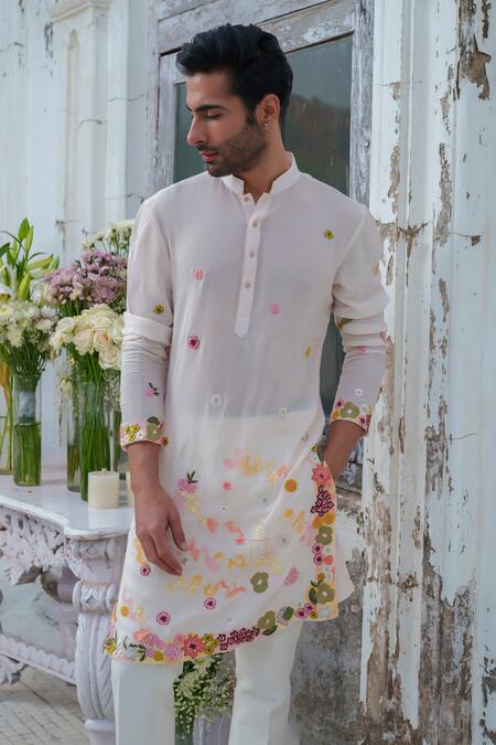 White kurta featuring full sleeves with french fleur thread, sequin, and bead embroidery. Paired with an ivory trouser.