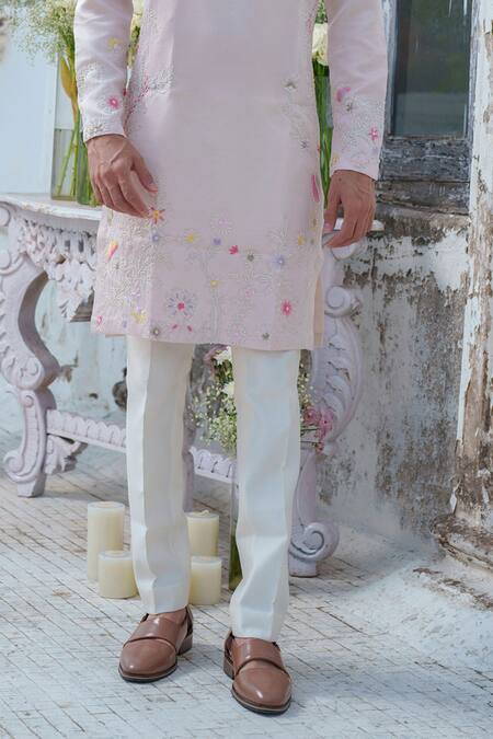 Baby pink kurta featuring full sleeves and garden bloom thread embroidery. Paired with an ivory trouser for a complete look.