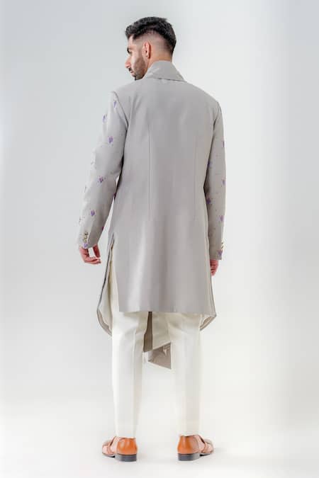 Grey kurta featuring full sleeves, stand collar, and geometric motif embroidery. Paired with ivory cotton silk trouser.