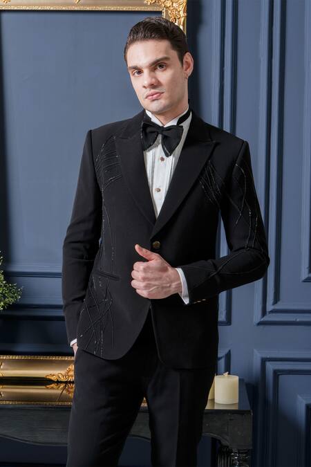 Buy_Amrit Dawani_Black Polyester, Cotton Embroidery Japanese Cutpipe Detailed Tuxedo Pant Set _Online_at_Aza_Fashions