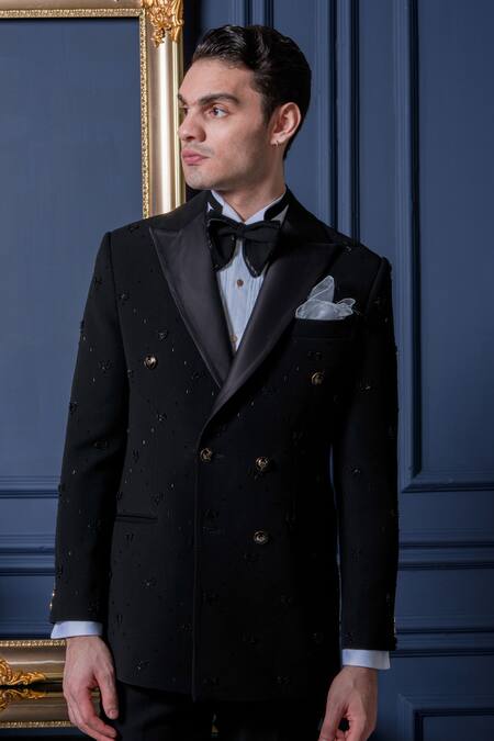 Buy_Amrit Dawani_Black Polyester, Cotton Japanese Peak Notch Double Breasted Tuxedo Pant Set