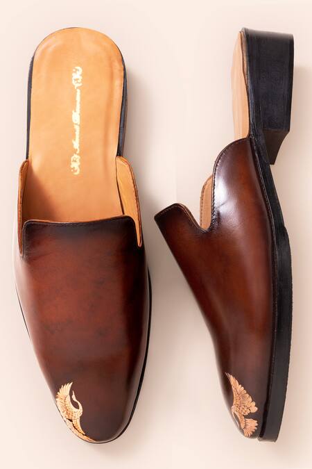 Brown Leather Bird Embossed Mules Shoes