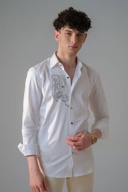 White Cotton Embroidery Lion Gaze Embellished Shirt