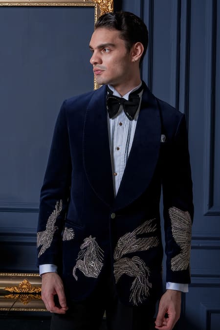 Buy_Amrit Dawani_Blue Velvet, Cotton, Polyester Beads, Majestic Unicorn Detailed Tuxedo Pant Set _Online_at_Aza_Fashions