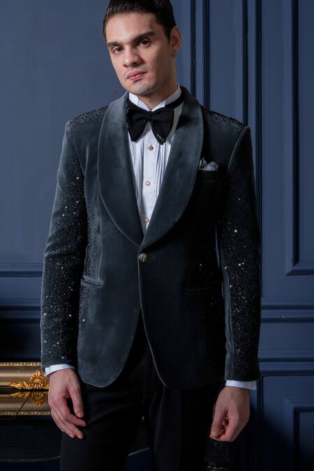 Buy_Amrit Dawani_Grey Velvet, Polyester, Cotton Sequins Radiance Detailed Tuxedo Pant Set _Online_at_Aza_Fashions