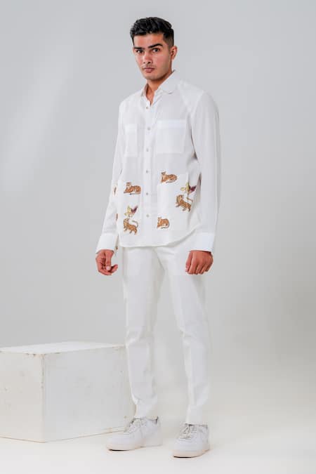 Buy_Amrit Dawani_White Cotton Embroidery Tiger Motif Hand Painted Shirt