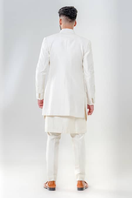 Ivory full sleeve jacket featuring tonal leaf embroidery and meenakari buttons. Paired with a matching kurta and trouser in cotton silk and cotton lycra fabrics.