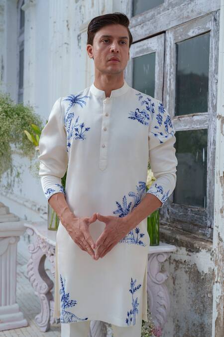 Ivory kurta featuring wild woods hand-painted detailing and a band collar. Paired with ivory trousers for a coordinated look.